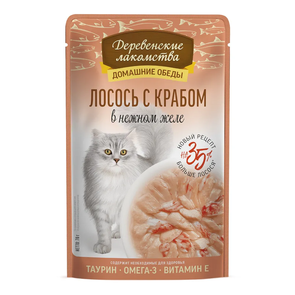 Деревенские лакомства конс. д/кошек «Лосось с крабом в нежном желе», пауч 70г