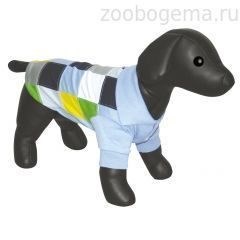 Футболка в разноцветную клетку и с синей отделкой на воротнике и рукавах.