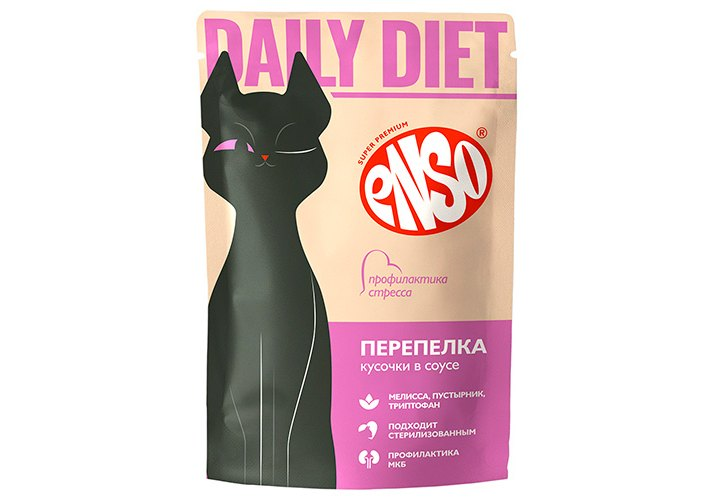 ENSO DAILY DIET Корм влажный полнорационный для взрослых кошек, профилактика стресса, кусочки в соусе с перепелкой, пауч 85г/24шт. (Без характеристики)