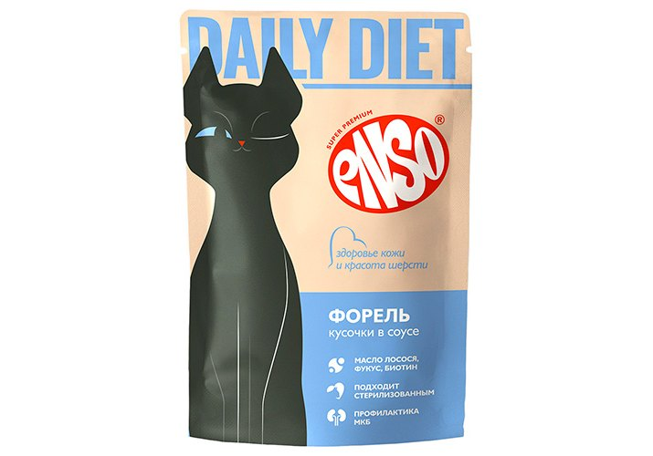 ENSO DAILY DIET Корм влажный полнорационный профилактический для взрослых кошек, поддержание здоровья кожи и красоты шерсти, кусочки в соусе с форелью, пауч 85 (Без характеристики)