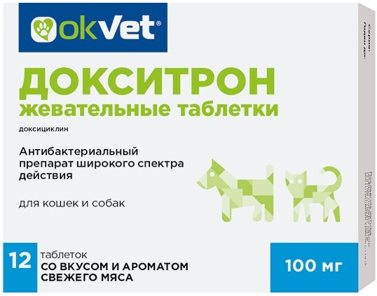 OKVET Докситрон жев. таб. для кошек и собак со вкусом и ароматом свеж. мяса 100мг №12