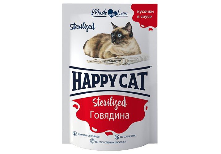 Паучи Хэппи Кэт для стерилизованных кошек /говядина кусочки/ в соусе (Россия) - 0,085 кг