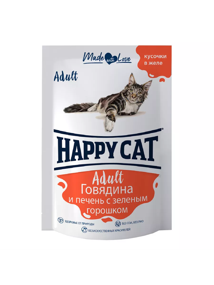 Паучи Хэппи Кэт /говядина - печень - горох/ в желе (Россия) - 0,085 кг